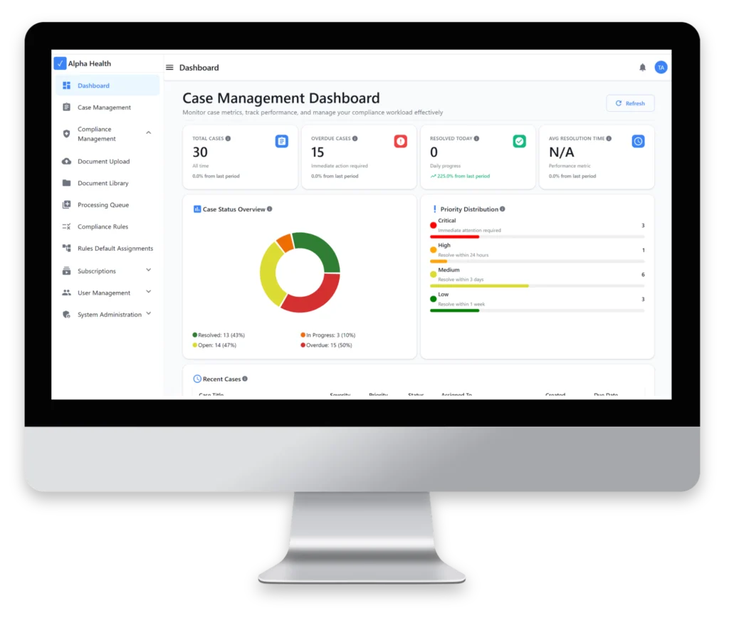 When issues appear, AlphaHealth Pulse creates and assigns a case, tracks it to completion, and preserves the full audit trail.